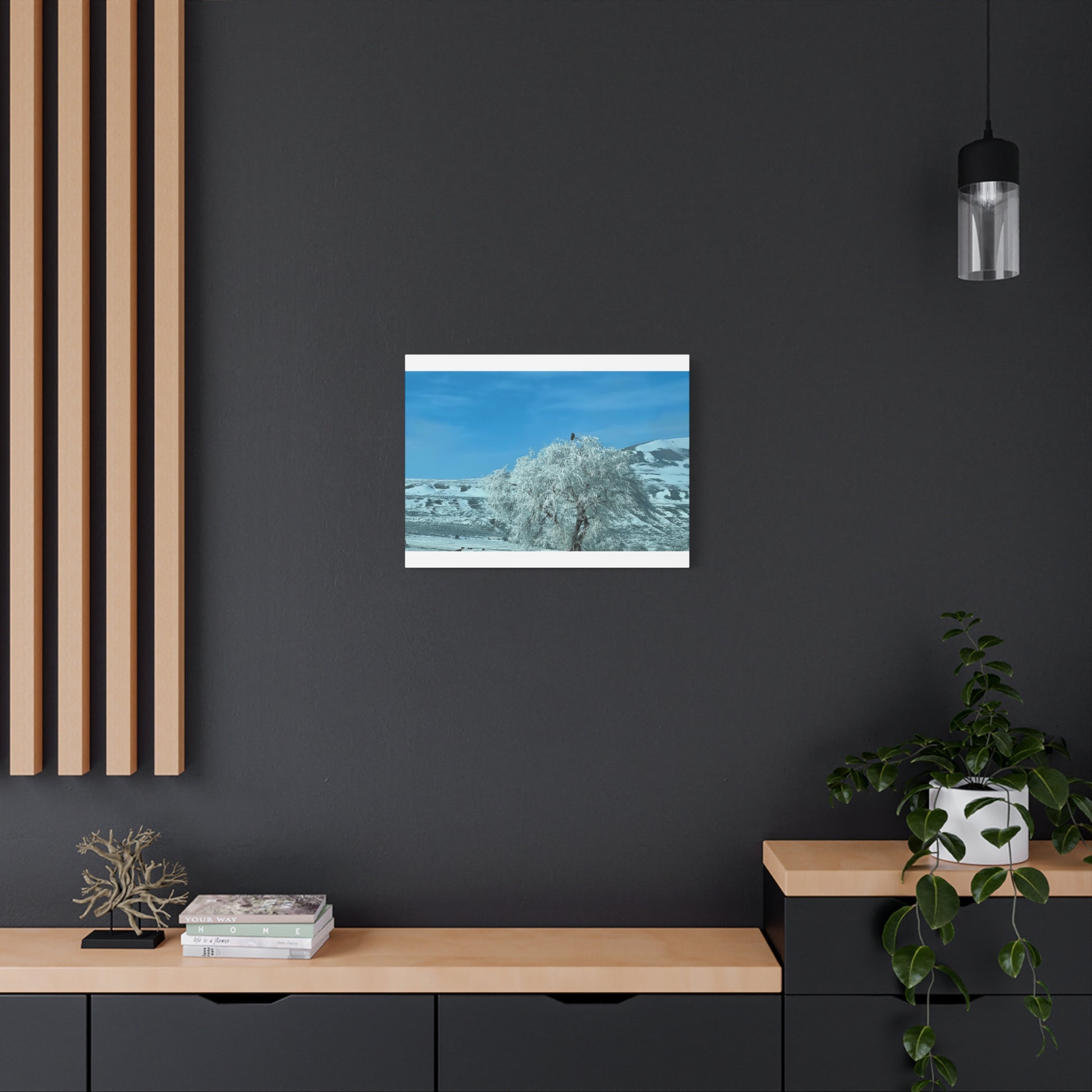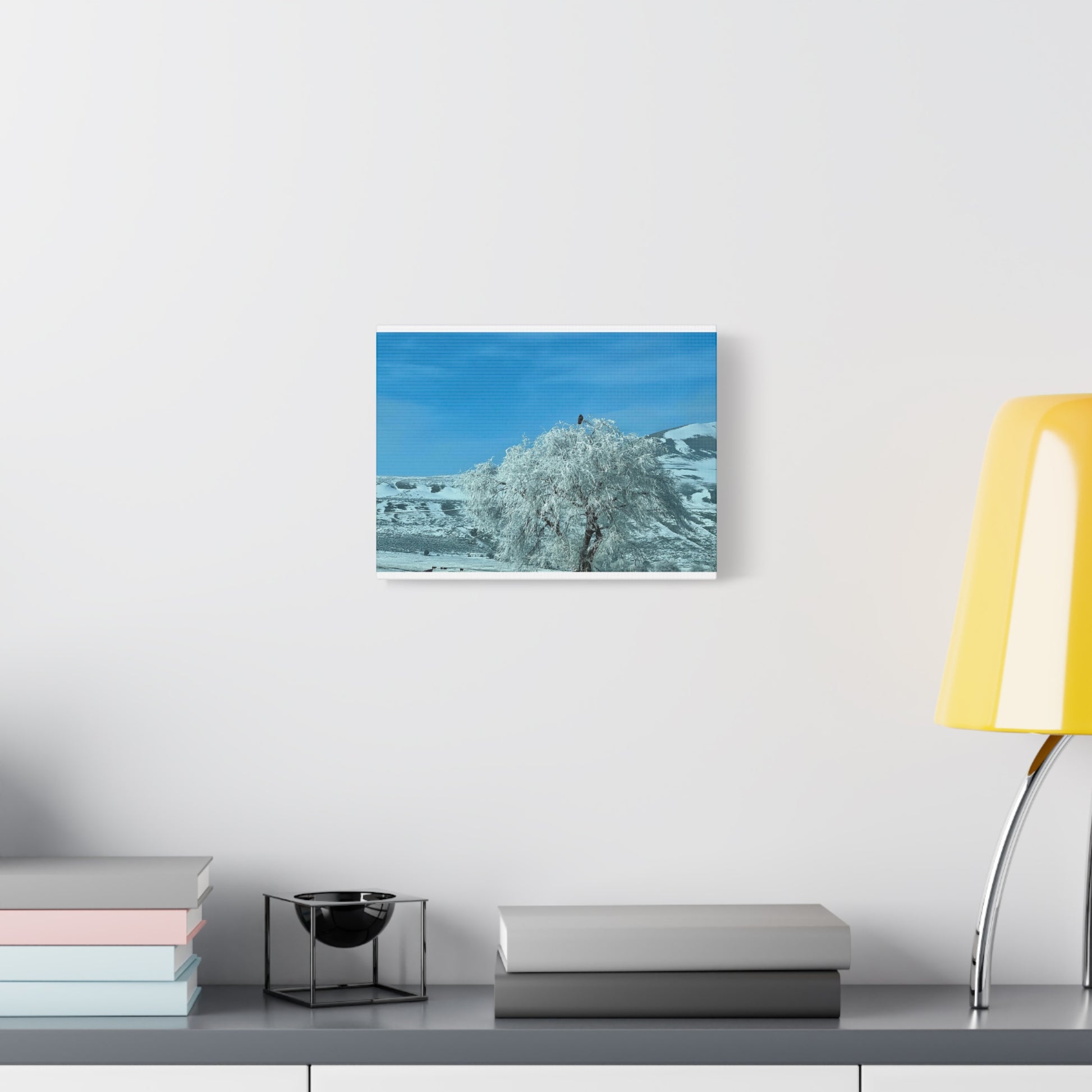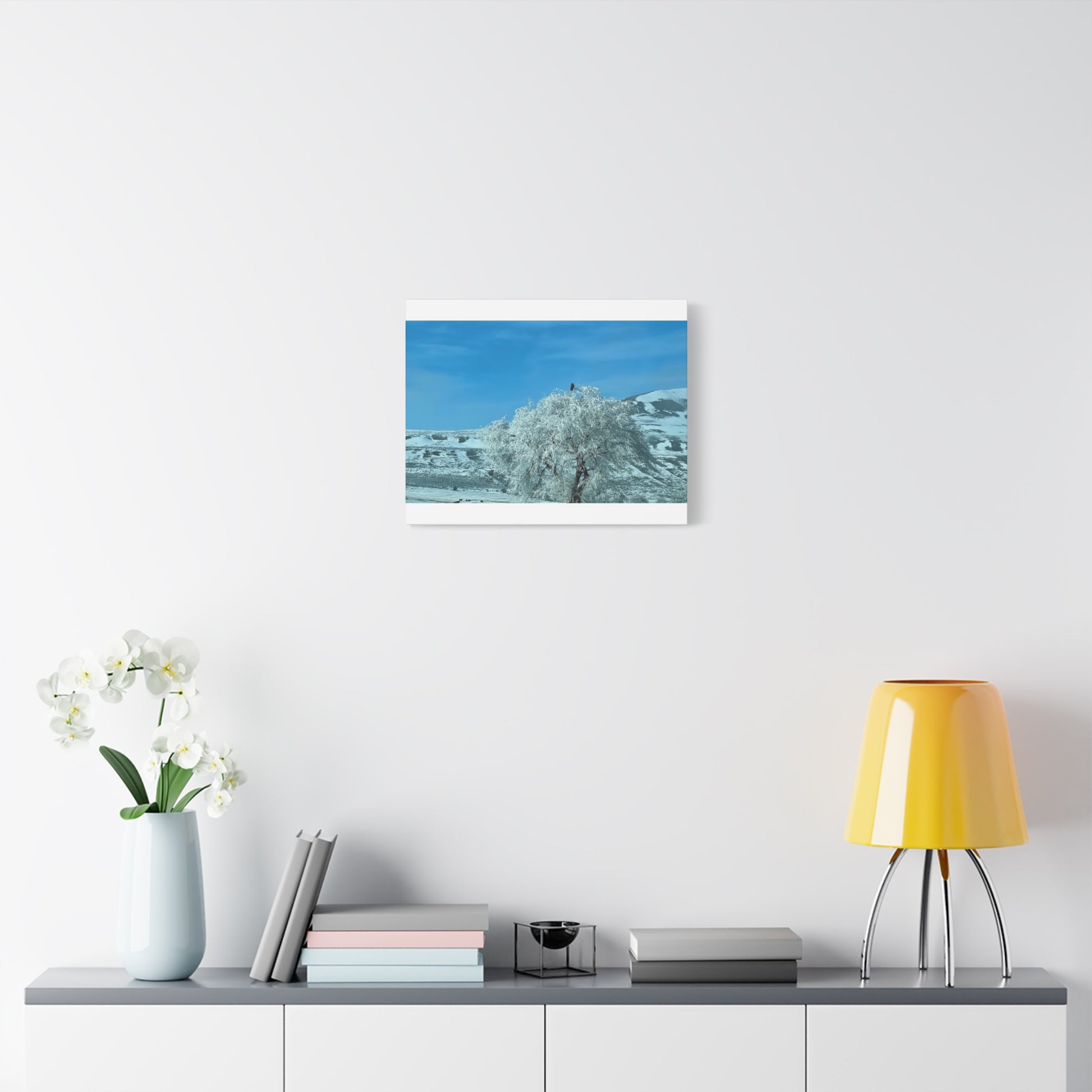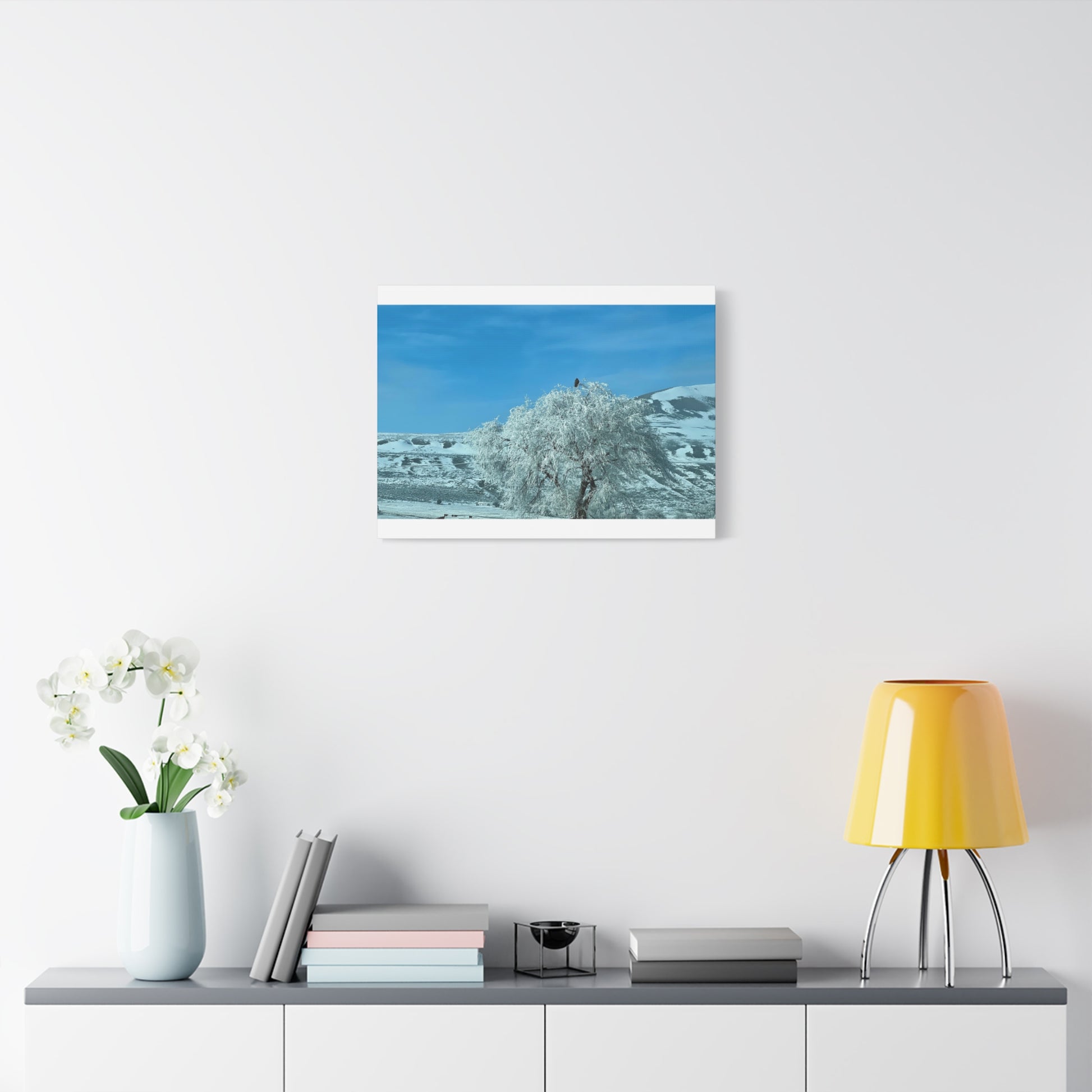 A serene winter scene printed on matte stretched canvas. Frost-laden branches bend under a pale sky, while distant ridges cut a quiet horizon—an image that brings stillness into living rooms, studios, or entryways. The sturdy 1.25" pine stretcher frame gives the piece a gallery-ready profile; soft rubber pads protect walls and keep the canvas steady. Colors are rendered with UL-certified Greenguard Gold latex inks that preserve subtle blues and icy neutrals without harsh gloss, creating a calm focal point that invites slow breaths and quiet moments.