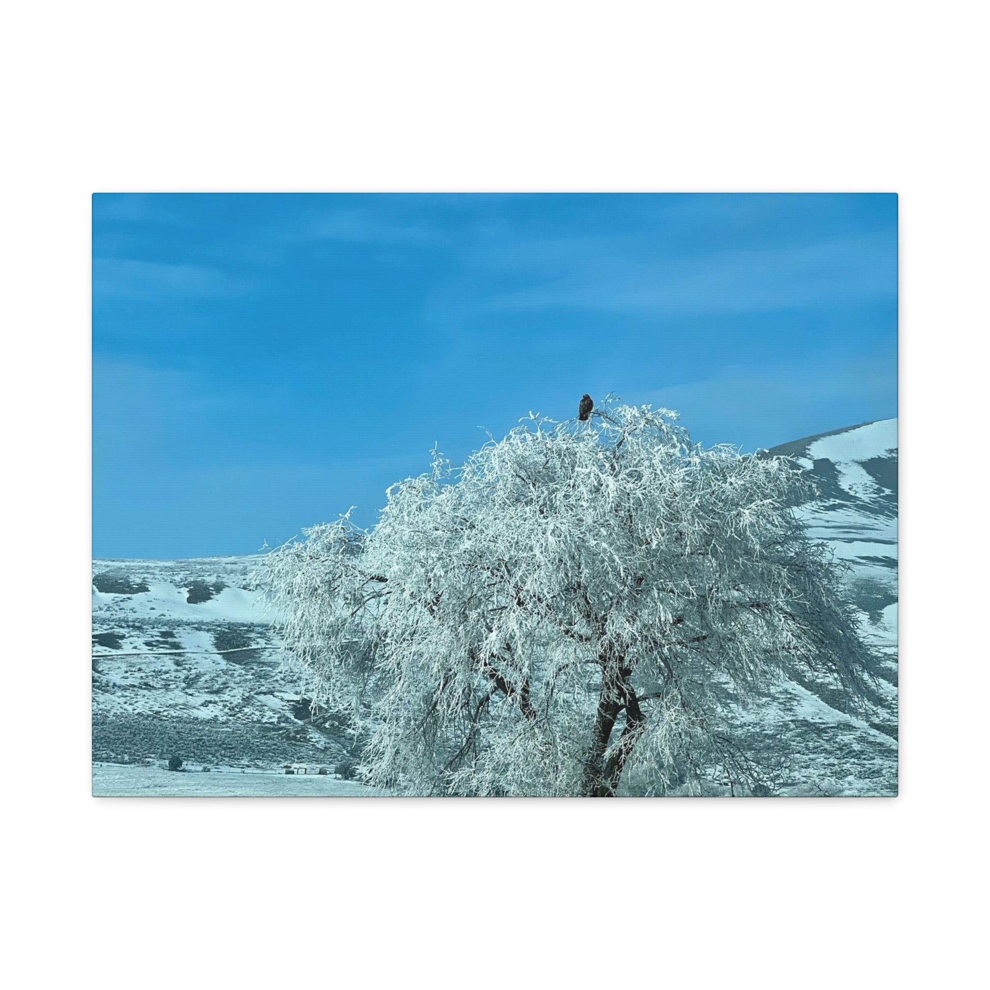 A serene matte canvas print that brings a hush of winter landscape into any room. The stretched cotton-poly canvas captures cool blues and frosted textures with a soft, non-reflective finish that feels painterly on the wall. The image—an isolated tree dusted in snow beneath a wide, crystalline sky—invites quiet reflection and a moment of calm. Stretched over a lightweight pine frame, it hangs flush and steady, held by subtle rubber corner supports and a ready-to-hang backing. This piece layers easily into cozy living rooms, tranquil bedrooms, or a study where stillness and clarity matter.